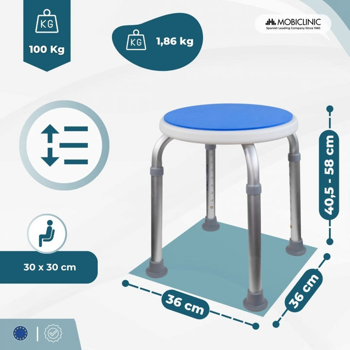 Lo sgabello da doccia Foco è progettato per garantire sicurezza, autonomia e comfort in bagno. La sua manopola regolabile consente di regolare rapidamente e senza attrezzi l'altezza su otto livelli, da 40 a 57,5 cm. Questo intervallo di regolazione consente di personalizzare la posizione di seduta, favorendo un'igiene più confortevole e su misura per l'utente.