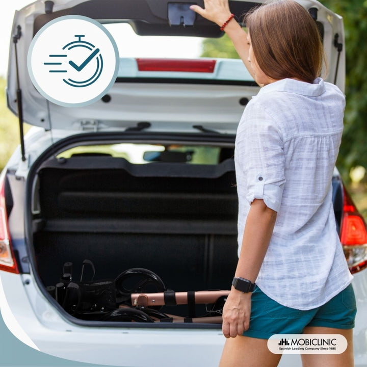 Andador plegable | Aluminio | Hasta 136 Kg | Frenos en manetas | Asiento y respaldo | Oro Rosa | Trajano | Deluxe | Mobiclinic
