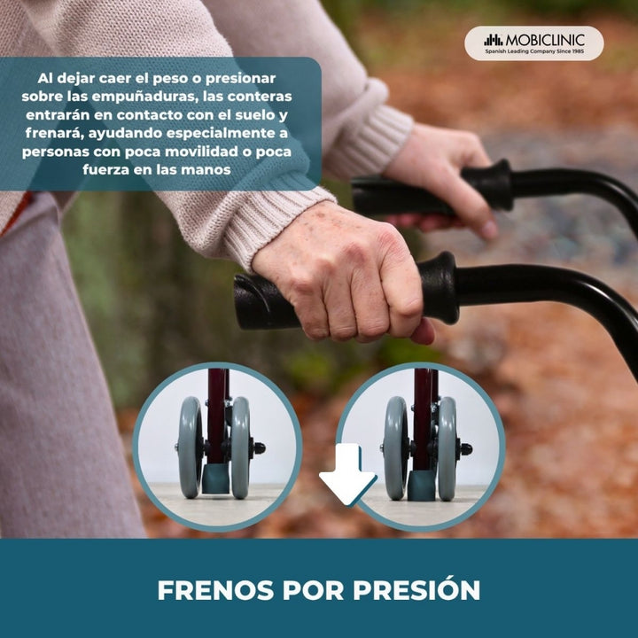 - Cuenta con dos ruedas delanteras giratorias 360º, un asiento confortable que permite el descanso del usuario, un respaldo acolchado y frenos que se activan por presión al ejercer fuerza sobre las empuñaduras (dejando caer el peso del cuerpo sobre los puños).