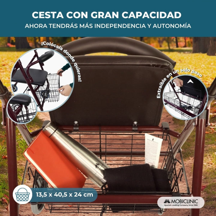 - Posee una cesta para la compra que puede colocarse debajo del asiento o en la parte frontal del andador.