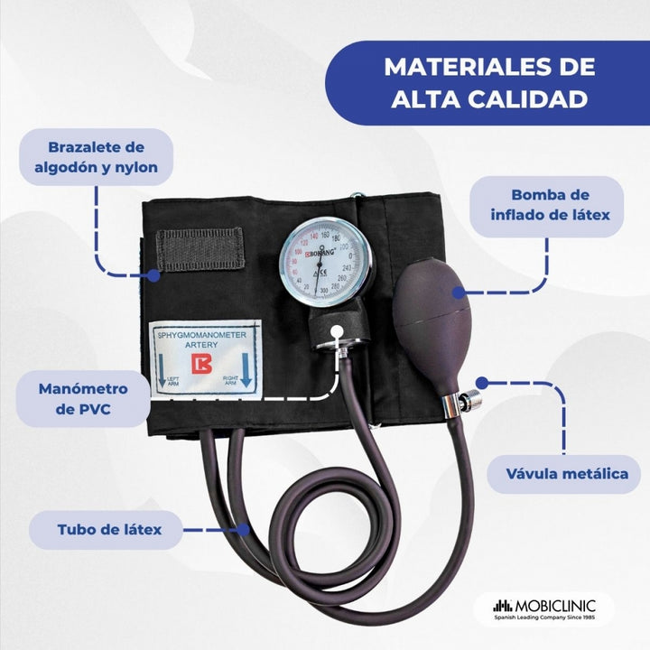 Con brazalete fabricado en algodón y nylon y con válvula y pera fabricadas en PVC y látex, este esfigmomanómetro de tipo palma resulta de una gran fiabilidad tanto a nivel particular como a nivel profesional, pues está fabricado de acuerdo con las normas EN 1060-1/2. Se caracteriza por su resistencia y su comodidad, ya que al ser muy ligero resulta fácil de transportar.