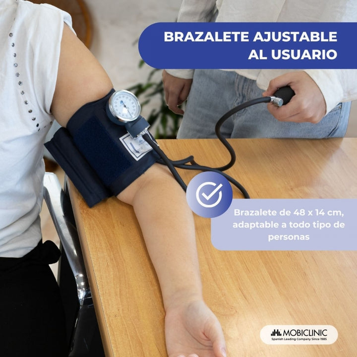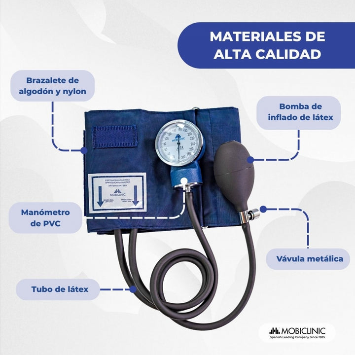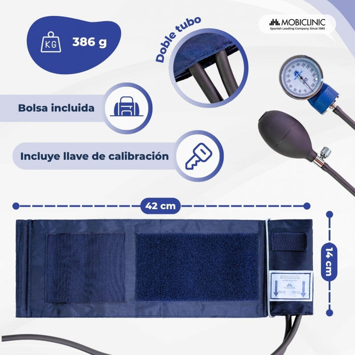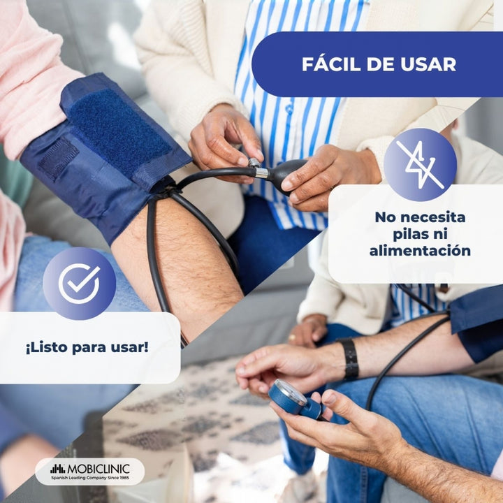 El tensiómetro aneroide o esfigmomanómetro es utilizado por los profesionales de la salud para medir la presión arterial de los pacientes. Este modelo en concreto es de tipo palma, compuesto por una bomba de goma conectada a un manguito. El tensiómetro aneroide se utiliza junto a un fonendoscopio para escuchar el pulso. Este tipo de tensiómetro es el más utilizado por los profesionales de la salud debido a su gran fiabilidad.