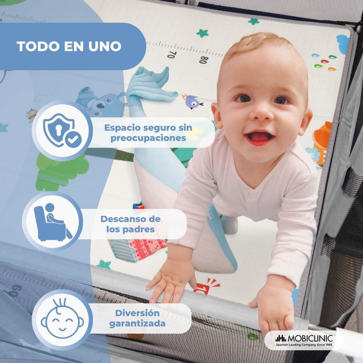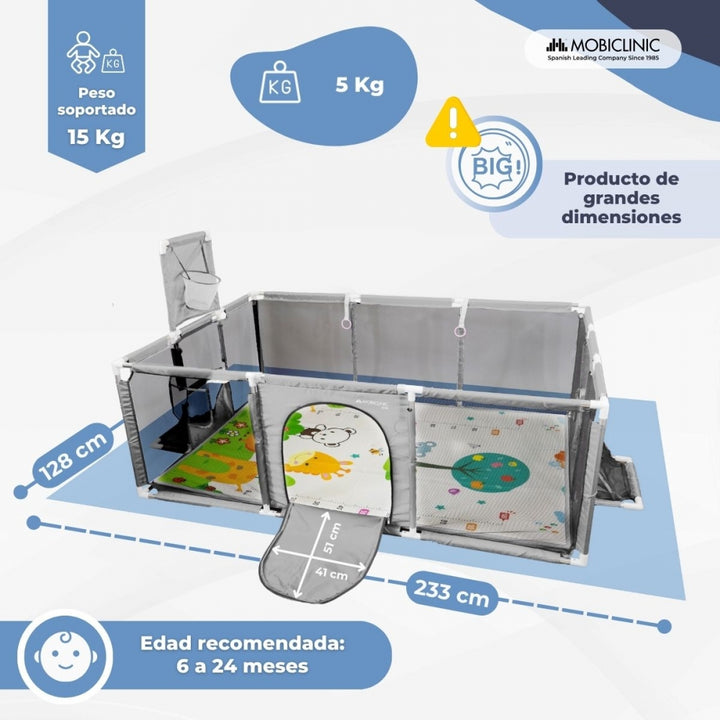 Grazie alle sue dimensioni di 128 x 233 cm, offre un'area gioco spaziosa e confortevole dove i più piccoli possono gattonare, stare in piedi, giocare o fare i primi passi in tutta sicurezza. Il tappetino incluso fornisce anche una superficie imbottita che isola il pavimento e migliora l'esperienza di gioco o di riposo.