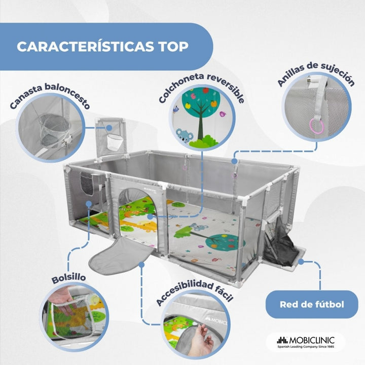 Il parco giochi Kidland è uno spazio che unisce gioco, sviluppo e divertimento per i più piccoli in un unico prodotto. Il suo design multifunzionale include un canestro da basket e una rete da calcio integrati, che stimolano l'attività fisica per bambini a partire dai 6 mesi di età.