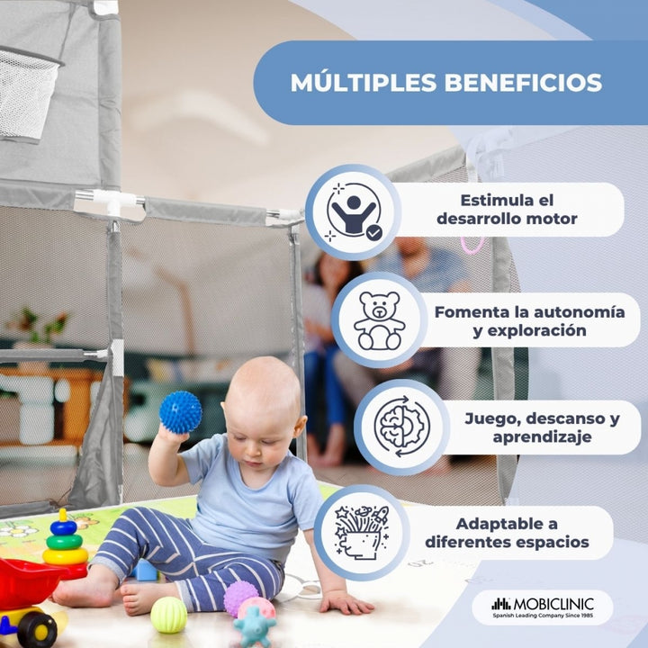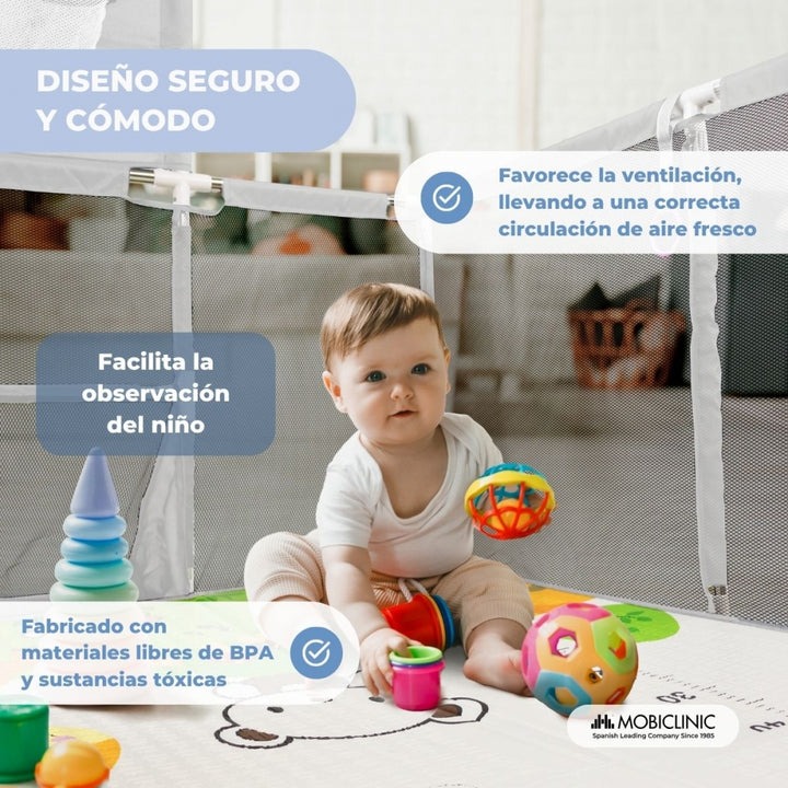 Per favorire l'indipendenza e la coordinazione dei più piccoli, il box è dotato di quattro anelli di sicurezza progettati per aiutarli a imparare a stare in piedi in modo graduale e sicuro. Le pareti in rete traspirante permettono ai genitori di monitorare il bambino in ogni momento e garantiscono anche una ventilazione costante.