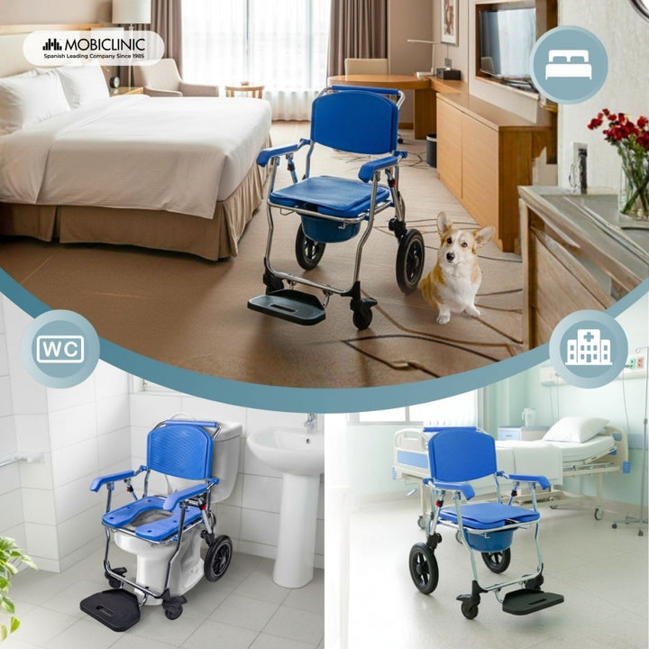 Il suo design pieghevole rende la sedia facile da riporre e trasportare. Può essere riposta senza occupare molto spazio e spostata facilmente da una stanza all'altra, rendendola ideale per case di cura, residenze e ospedali. La sua struttura è progettata principalmente per facilitare le attività quotidiane, riducendo i movimenti bruschi e le posture scorrette.