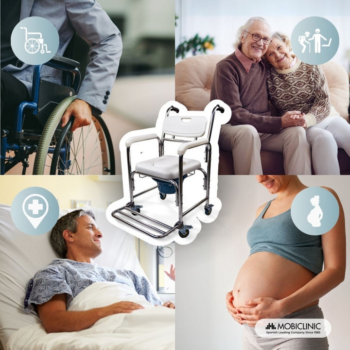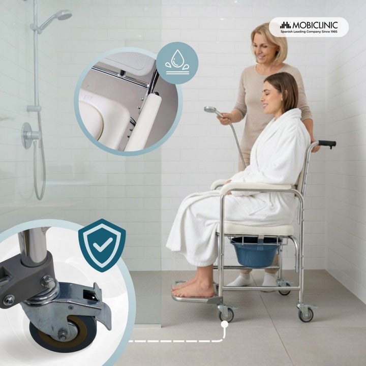 È versatile e può essere utilizzata come sedia comoda, sedia da doccia, rialzo per WC e sedia da trasferimento, adattandosi alle esigenze di tutti gli utenti. È dotata di freni su tutte e quattro le ruote per una maggiore sicurezza e per evitare movimenti involontari.
