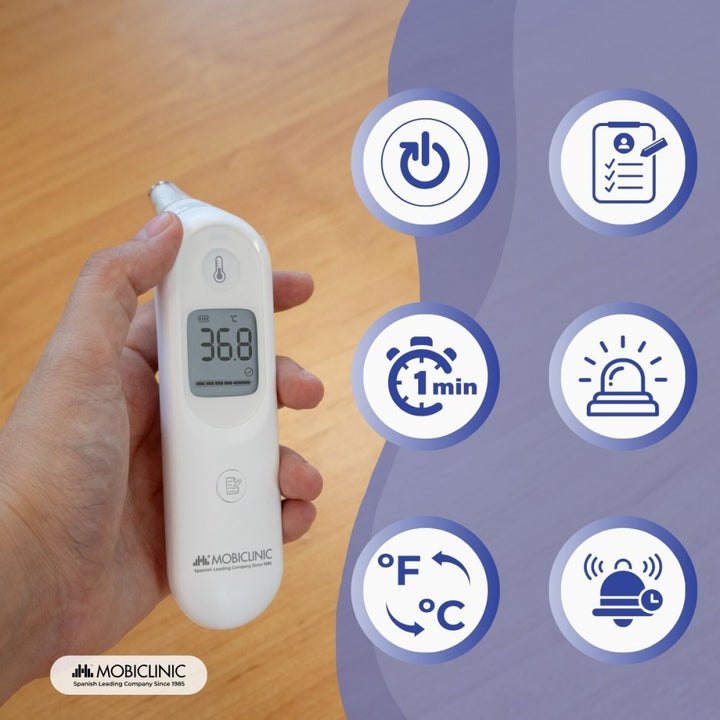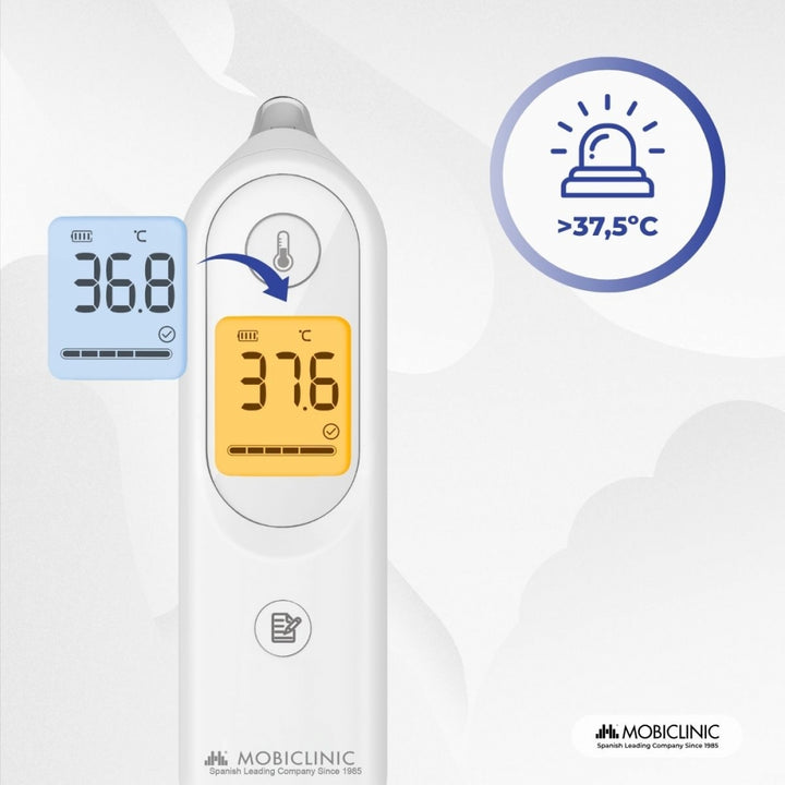 La sua punta morbida e sagomata è progettata per un utilizzo sicuro nell'orecchio. È dotato di un sistema di allarme intelligente che rileva se la temperatura supera i 37,5 °C ed emette un segnale acustico lungo seguito da tre brevi, insieme al display arancione, avvisando l'utente in modo chiaro e rapido. Un altro grande vantaggio è la sua memoria integrata, che memorizza le ultime 7 misurazioni, consentendo il monitoraggio per monitorare i progressi in caso di febbre prolungata.